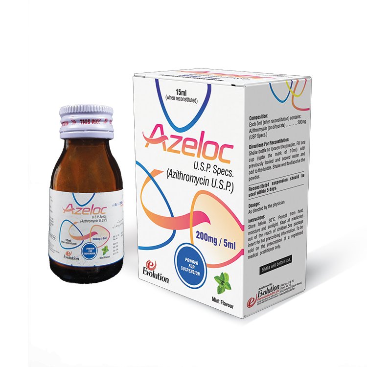 Overview: Azeloc Suspension is a potent antibiotic manufactured by Evolution Pharmaceuticals (Pvt.) Ltd. It contains Azithromycin (as dihydrate) in a powder form that, when mixed with water, creates a 15ml oral suspension. Adhering to United States Pharmacopeia (U.S.P.) standards, it is designed for effective treatment of various bacterial infections with the added benefit of a pleasant mint taste.