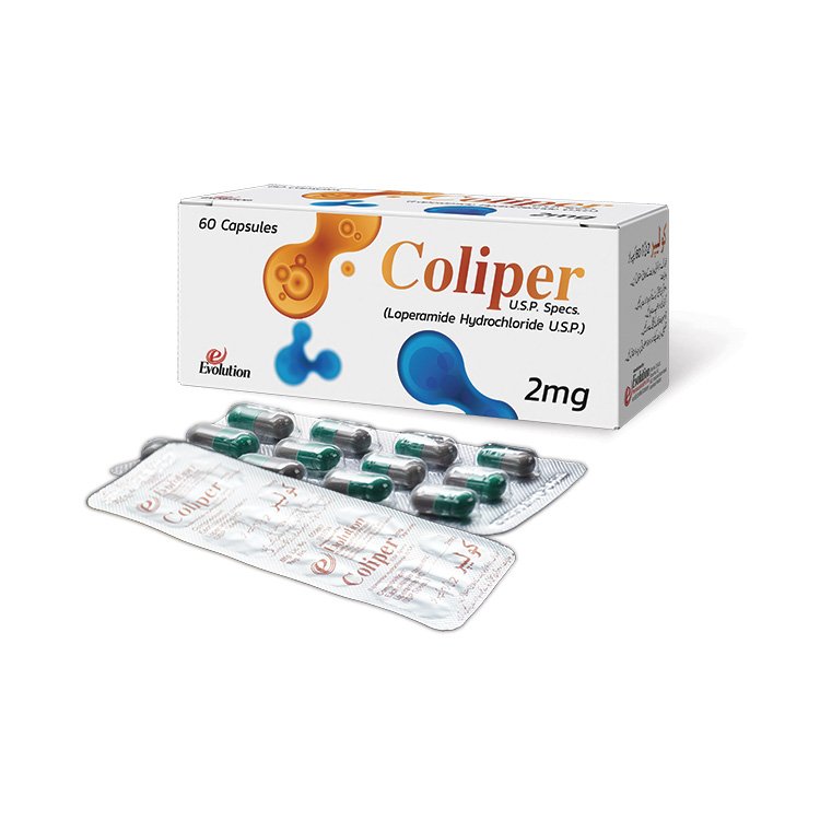 Overview: Coliper 2mg is a high-quality medication manufactured by Evolution Pharmaceuticals (Pvt.) Ltd. Each pack contains 60 carefully formulated capsules, each providing 2mg of Loperamide Hydrochloride. The product strictly meets U.S.P. specifications, ensuring maximum quality, efficacy, and reliability for patients managing specific gastrointestinal conditions.